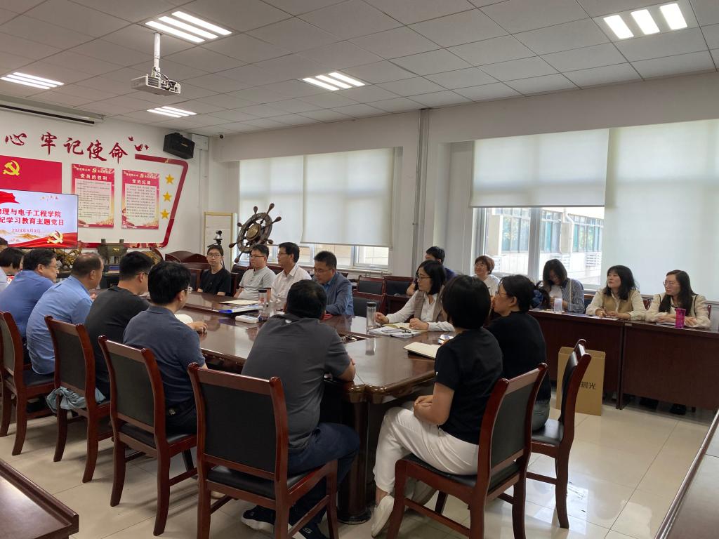 根据《中共中央办公厅关于在全党开展党纪学习教育的通知》和《中共山东省委办公厅关于在全省开展党纪学习教育的通知》要求和党中央、省委有关会议精神,为深入学习贯彻习近平新时代中国特色社会主义思想和党的二十大精神,扎实开展党纪学习教育,5月9日下午,物理与电子工程学院教工党支部在学院会议室召开全体党员大会,开展了党纪学习教育主题党日活动,会议由党支部书记岳现房主持。