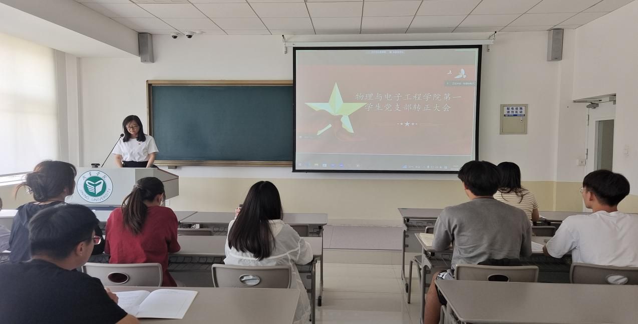 2024年6月7日下午,物理与电子工程学院学生第一党支部在9号教学楼a214教室召开2024年上半年预备党员转正大会。学生党支部全体师生党员参加会议,会议由学生第一党支部书记赵杨洋主持。会议主要讨论研究付加硕等13名预备党员转正情况。