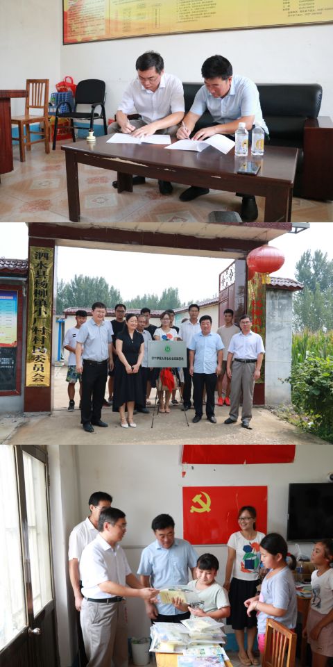 自2016年以来物理与信息工程系以“三下乡 千村计划”为平台,连续三年在小厂村开展以“义务支教、新农村文化建设”为主题的志愿服务活动,为本次签约和实践基地揭牌奠定扎实基础。签约仪式在杨柳镇小厂村村委会党员活动室举行,双方围绕“加强组织共建,做好结对帮扶,开展爱心支教,推动新农村文化建设”等方面进行深入交流探讨。接着,物理与信息工程系党总支书记孙文和杨柳镇小厂村党支部书记郭运伟在《“结对共建”协议书》上签字,并为社会实践基地揭牌。随后,随同领导看望“三下乡”社会实践的同学们,并向该村贫困学生赠送了学习用品。