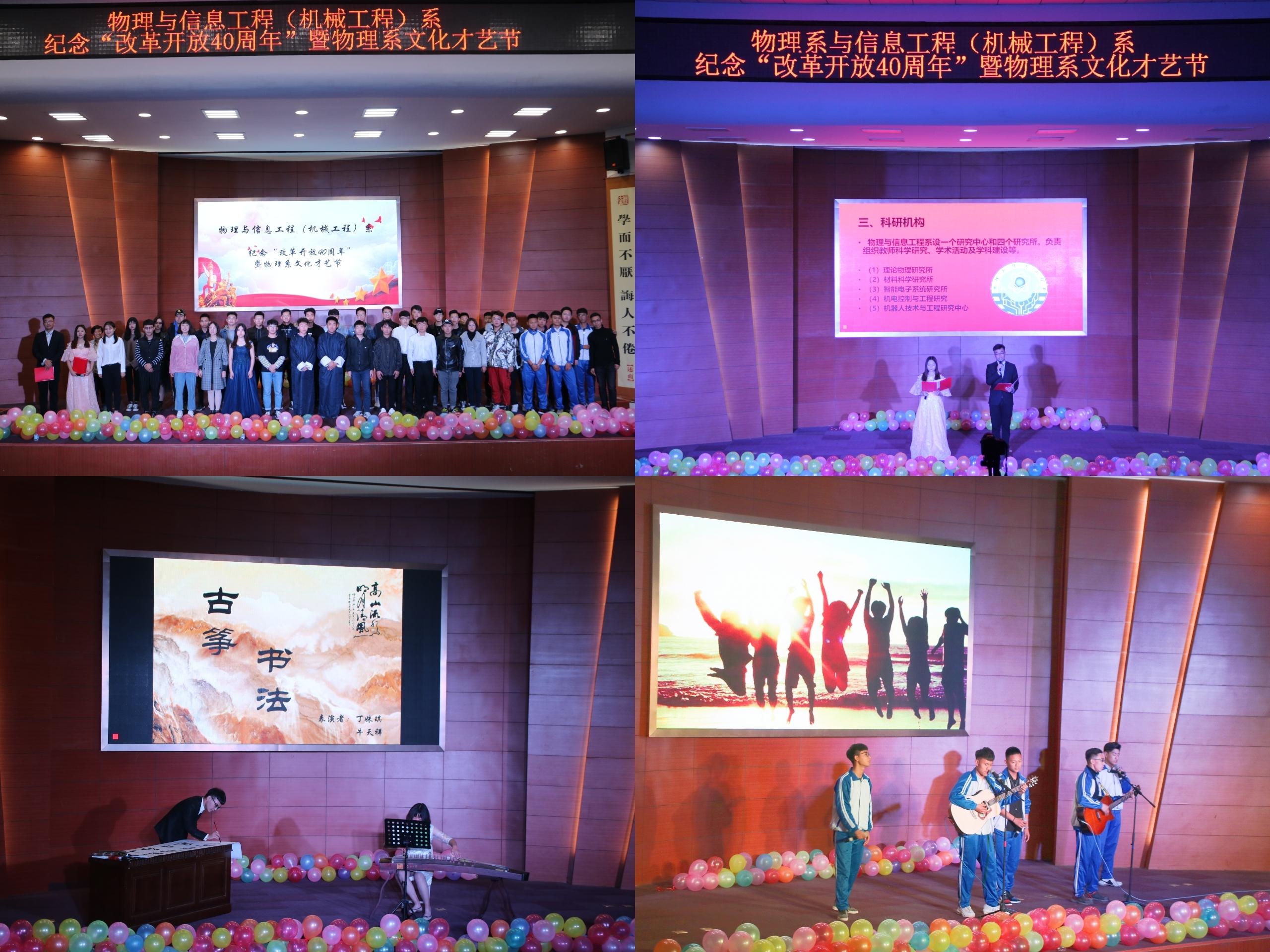 为庆祝改革开放40周年,全面贯彻落实习近平新时代中国特色社会主义思想和党的十九大精神,讲好改革开放故事,讲好新时代中国特色社会主义故事,讲好济宁学院故事,11月16日晚物理与信息工程(机械工程)系在理科楼报告厅举办“庆祝改革开放40周年文化才艺节”活动。