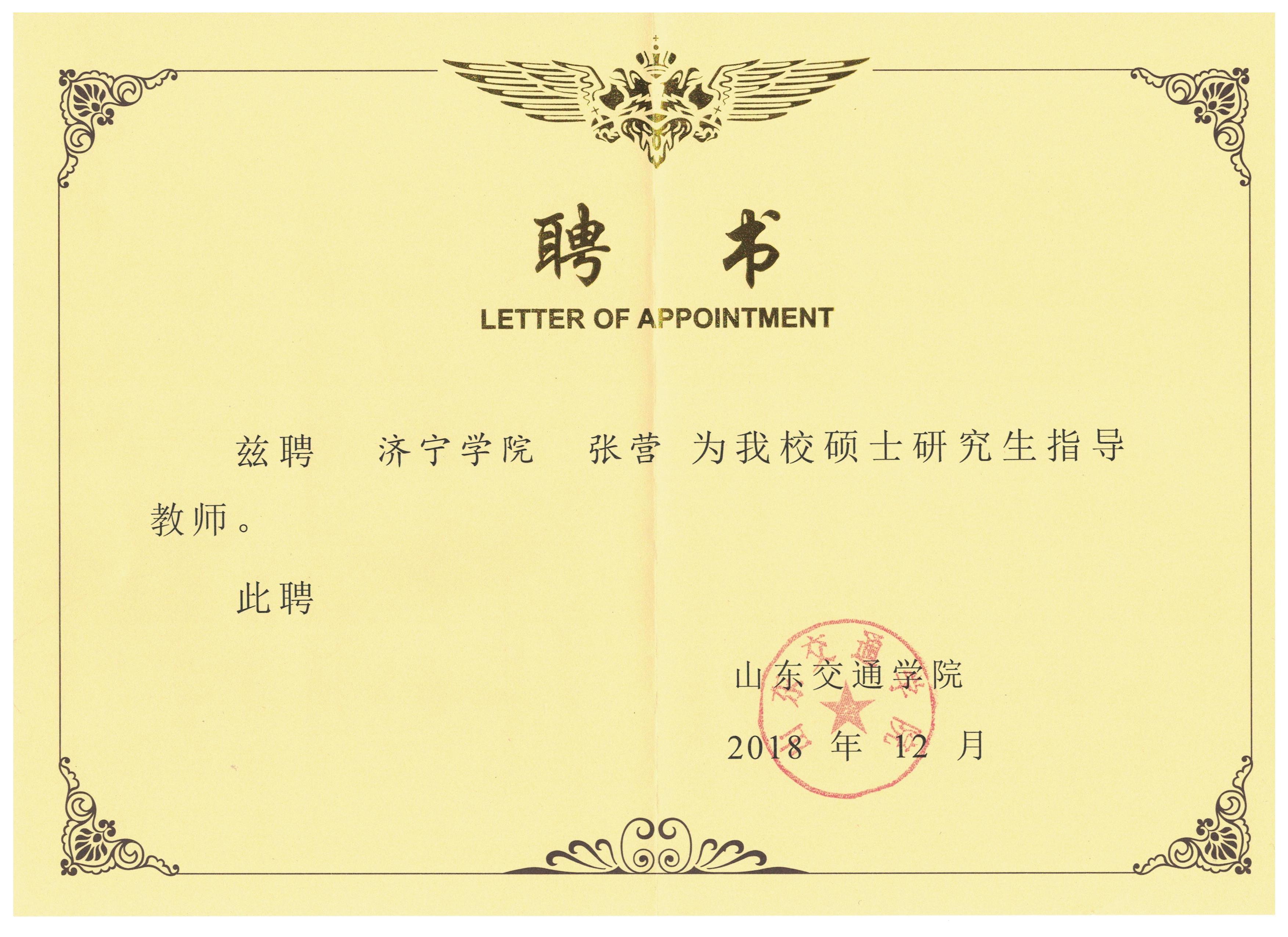 近日,根据我校与山东交通学院签订的“专业学位硕士研究生联合培养协议”,经山东交通学院各学院学位评定分委员会评审、山东交通学院学位评定委员会讨论通过,我系张营、宋文龙二位老师增选为山东交通学院专业学位兼职硕士生导师。