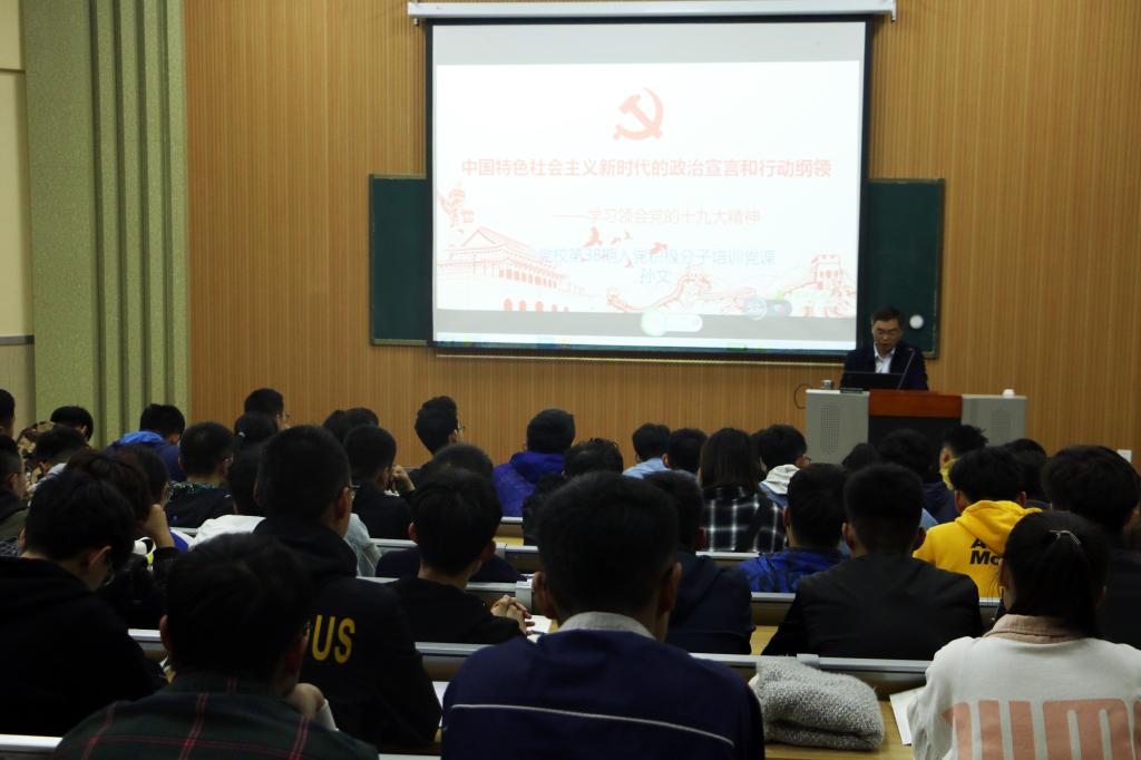 孙文在动员讲话中强调了本次培训的重要性,并对在场的积极分子提出了严格要求。随后做了题为《中国特色社会主义新时代的政治宣言和行动纲领——学习领会党的十九大精神》专题报告。本次报告以 “党的十九大”为中心,以“三个一”“五个时代”“三个角度”“八个明确”为体系深入解读新时代党的政治纲领和行动宣言。