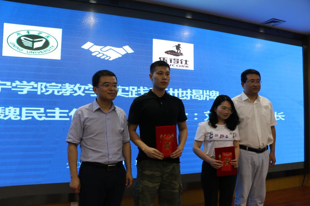 程杰、刘宝宣先后致辞,大家一致认为,济宁学院与乐得仕公司合作并设立实践教学基地,有利于增强学校教育与企业实践之间的联系,促进课堂教学与生产实践的衔接,也为双方开展更广泛、更深入的合作提供了很好的平台。程杰与王洋签署了“济宁学院与山东乐得仕软木发展有限公司产学研合作协议”,魏民与刘宝宣为“济宁学院实践教学基地”揭牌,最后刘宝宣和胡劲昌为我校材料科学与工程专业的优秀实习生颁发了奖励证书和奖金。