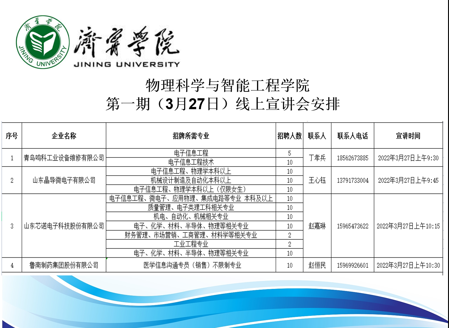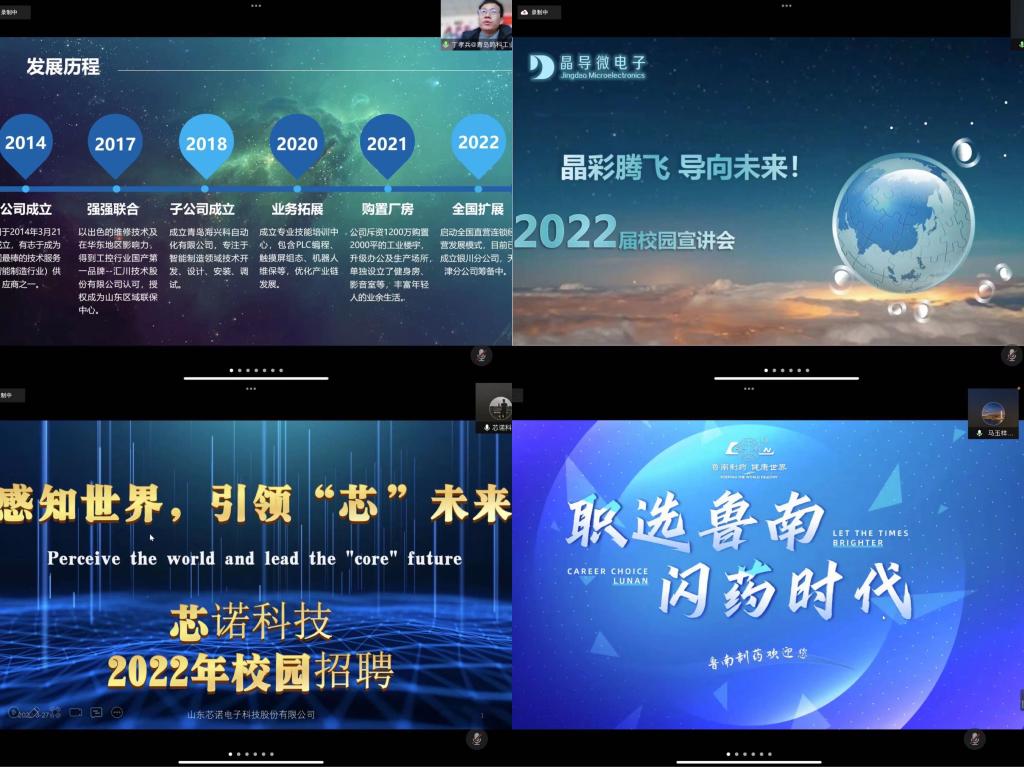 3月27日,K体育·(sports)官方网站举办2022届毕业生企业线上宣讲会。根据疫情防控管理要求,本次宣讲会采取线上方式进行。青岛鸣科工业设备维修有限公司、山东晶导微电子有限公司、鲁南制药集团股份有限公司等10余家单位应邀参加本次宣讲会,并通过腾讯会议进行宣讲。K体育·(sports)官方网站领导班子成员、学生工作处副处长刘勇、全体毕业班辅导员和近300名2022届毕业生参加会议。