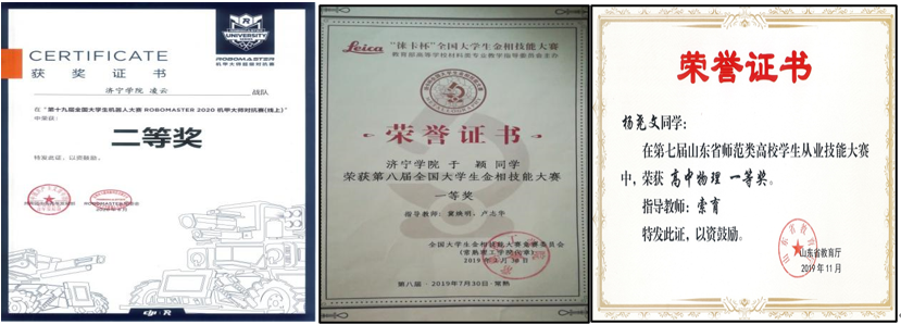 2019-2021年,指导学生在全国大学生金相技能大赛、全国大学生电子设计竞赛、全国大学生机器人大赛RoboMaster机甲大师赛、“挑战杯”全国大学生课外学术科技作品竞赛、山东省师范类高校学生从业技能大赛等学科竞赛中获国家级学科竞赛奖励9项,省级学科竞赛奖励81项;指导学生立项省级大学生创新创业训练计划项目6项,校级大学生研究性学习与创新性实验计划项目13项。