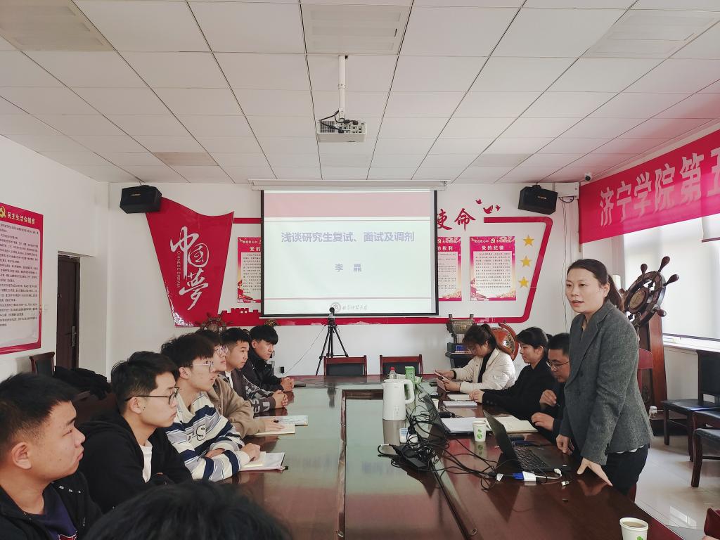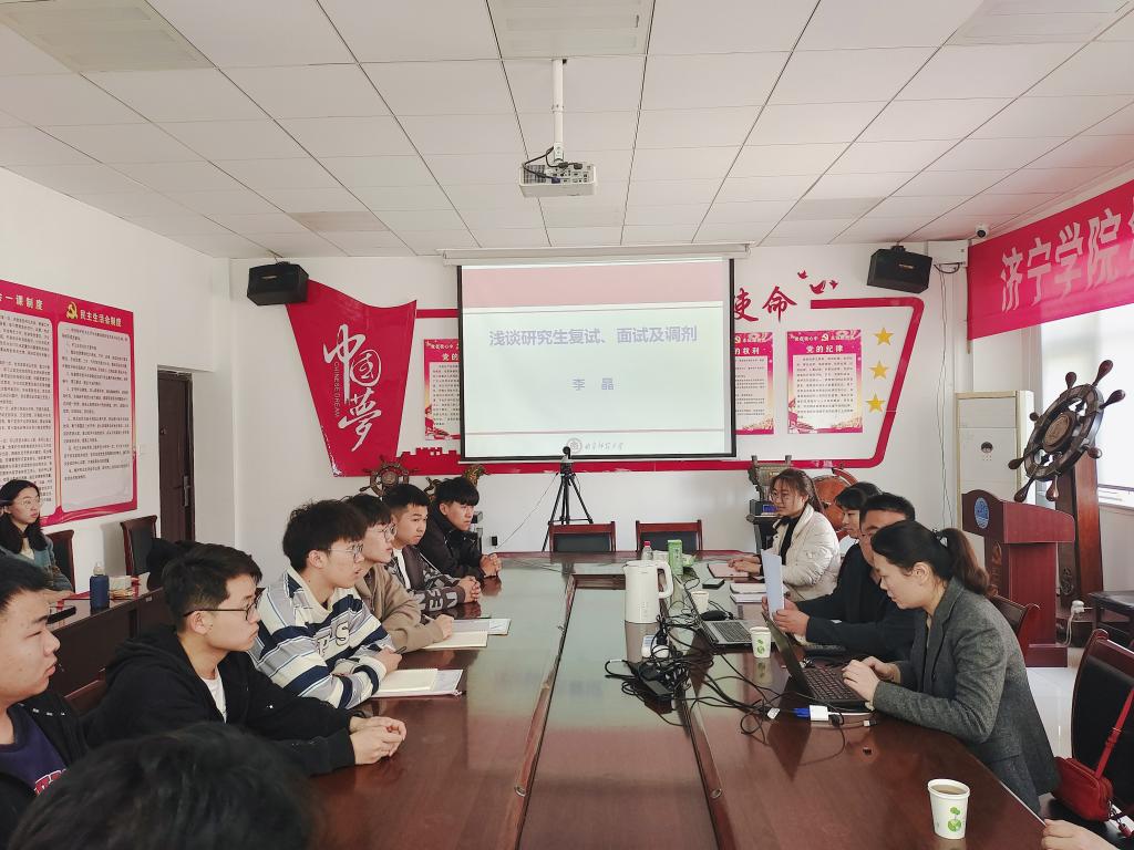 会上,李晶以《浅谈研究生复试、面试及调剂》为题与同学们做了交流分享。主要从研究生复试注意事项、面试技巧以及如何提高调剂成功率等几个方面进行了深入浅出的讲解,增加了同学们对研究生复试和调剂的深入了解。