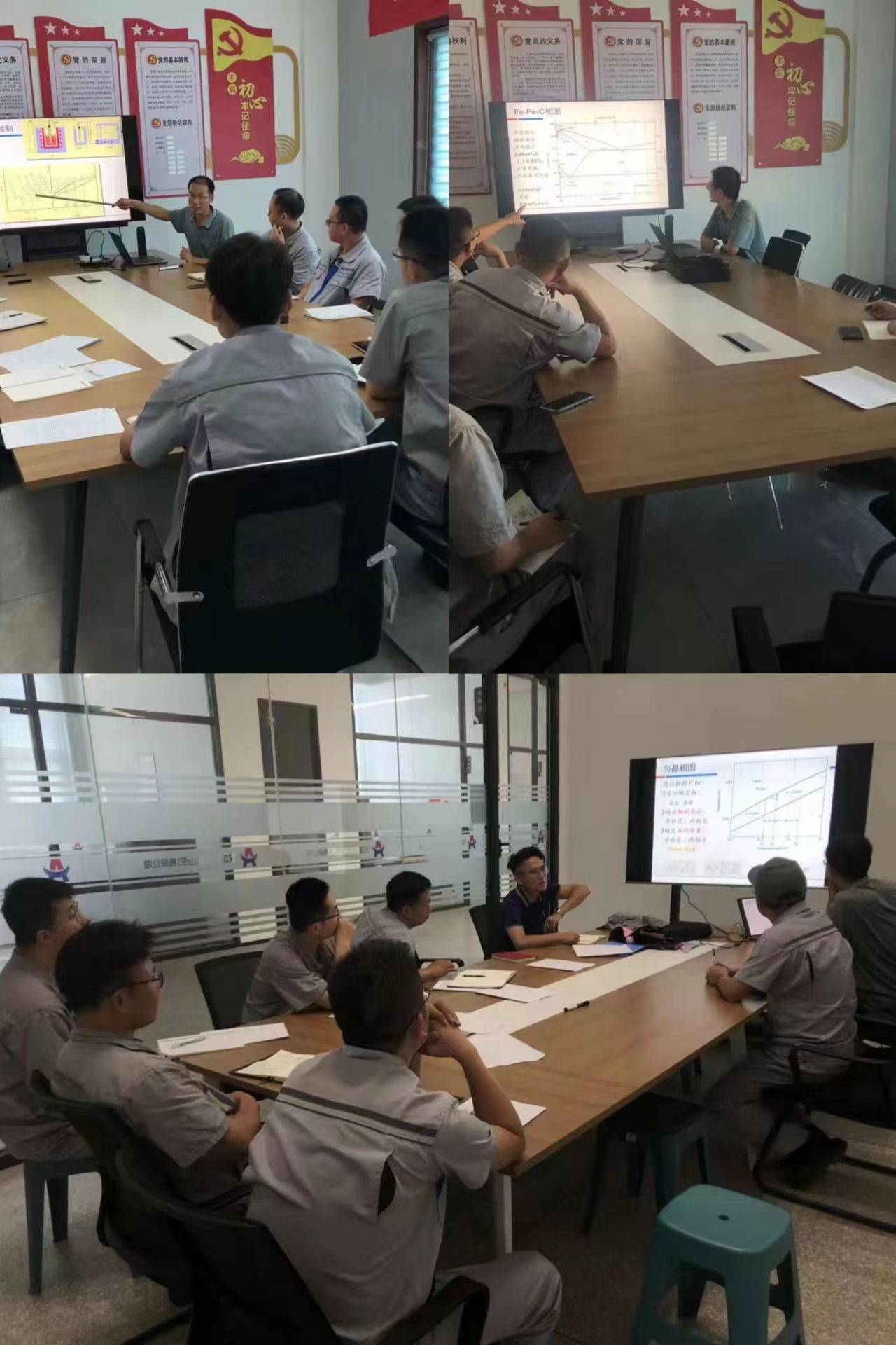 授课过程中,冀焕明详细介绍了合金相图的用途、相图的绘制方法和匀晶、共晶以及包晶相图在平衡以及非平衡冷却条件下的相和组织的转变规律,同时介绍了合金在冷却凝固过程中容易出现的缺陷和预防,重点讲解了铁碳合金相图部分相关内容,介绍了铁碳合金相图的基本元素、相区,以及共析钢、亚共析钢、过共析钢以及共晶白口铸铁、亚共晶白口铸铁、过共晶白口铸铁在冷却结晶过程中相和组织的平衡转变规律,并就技术部人员提出的问题进行了详细解答和技术交流。