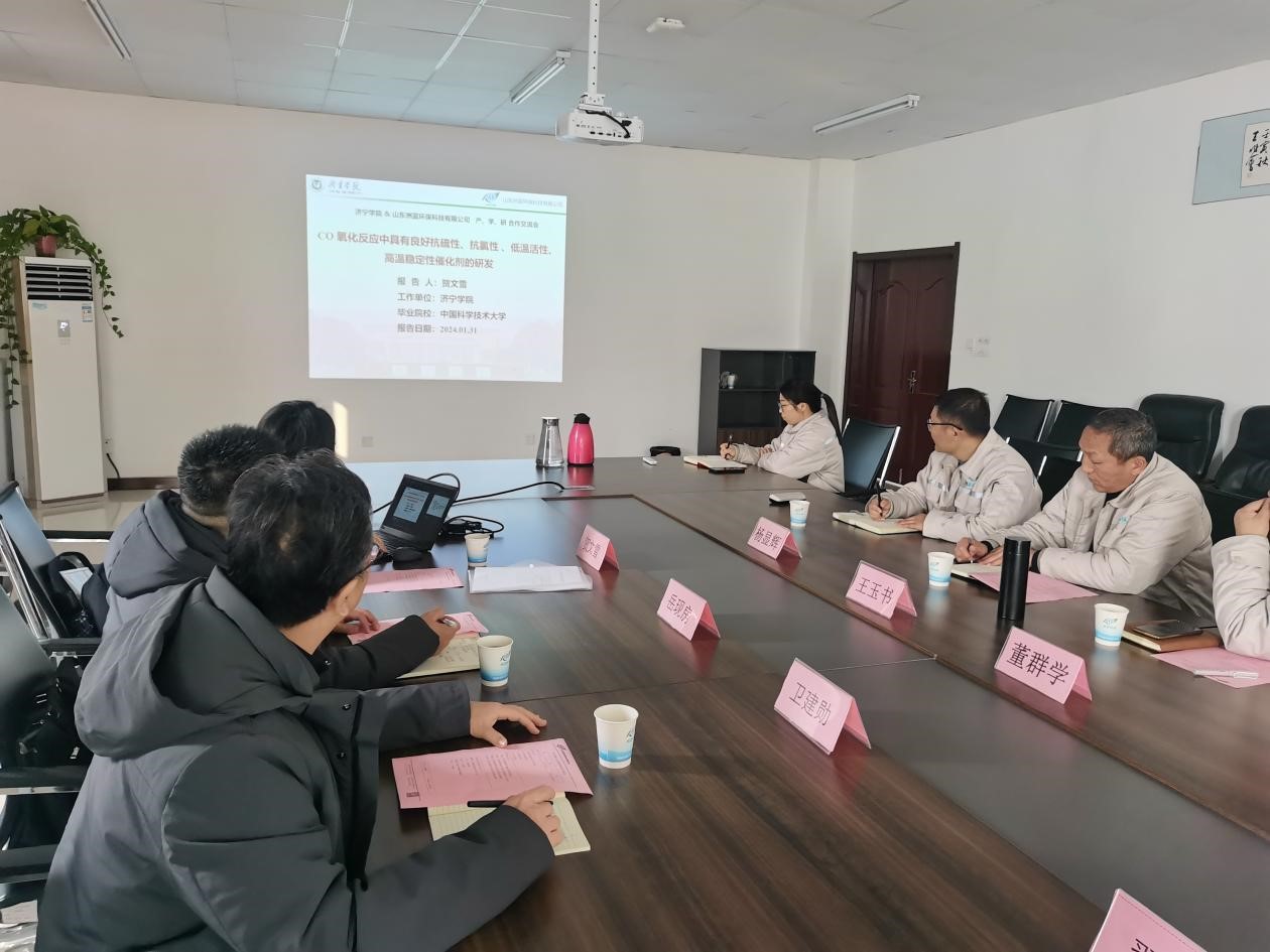 随后,在研发中心会议室进行了合作交流座谈。集团副总裁兼洲蓝公司总经理董群学、副总经理王玉书、总工程师崔卫东、副总工程师杨显辉、人力资源部部长王晶等参加了座谈会。董群学简要介绍了企业的情况和行业发展趋势,说明了目前在高炉煤气精脱硫、VOCs治理等方面的技术需求,表达了与学院的合作意向。卫建勋、岳现房、翟倩倩分别介绍了济宁学院的办学理念、人才引进,物理学院的学科建设、科研平台、学术成果、学生培养等情况。双方就产学研基地建设、人才培养、实习实训基地建设、博士科研促发展等话题进行了深入交流。