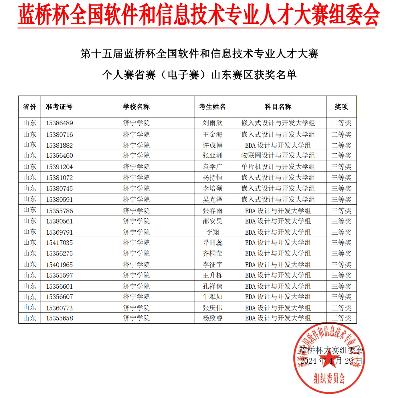 日前,第十五届“蓝桥杯”全国软件和信息技术专业人才大赛公布结果。物理与电子工程学院参赛共计19名学生获奖,获奖率约59.4%,其中获电子类省二等奖4项,省三等奖15项,获奖率、奖项质量和数量均创历史新高。