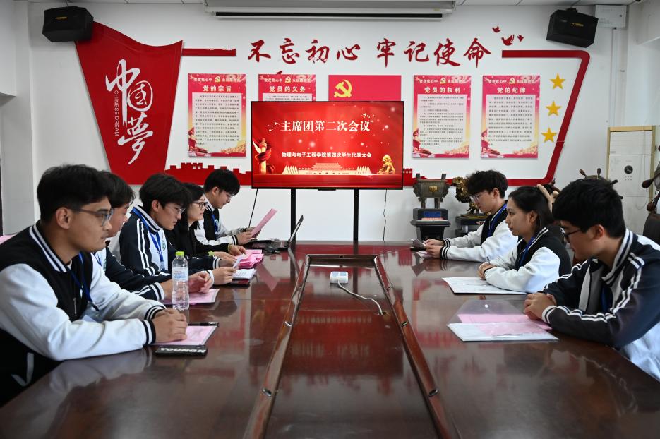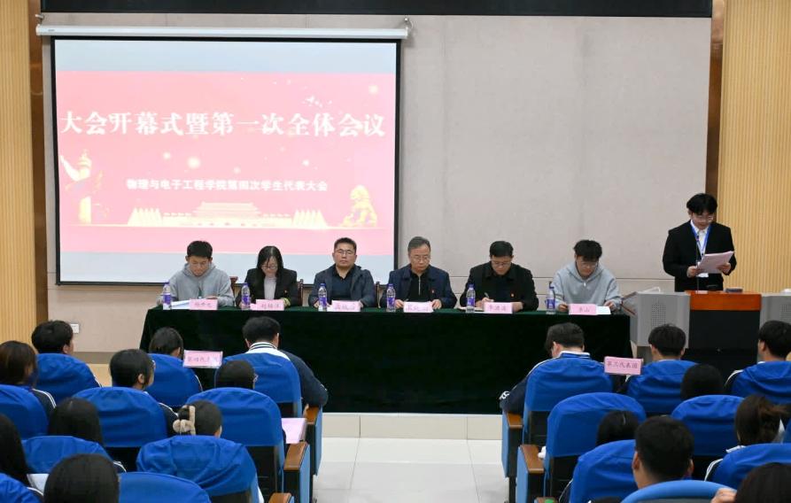 11月7日,物理与电子工程学院第四次学生代表大会在9号楼D101隆重开幕。学院党委书记卫建勋、副院长岳现房、党委副书记李洪波、团委书记赵杨洋,校学生会主席李山,校学生会志愿实践部(创业社)部长杨开元及95位学生代表参加大会。