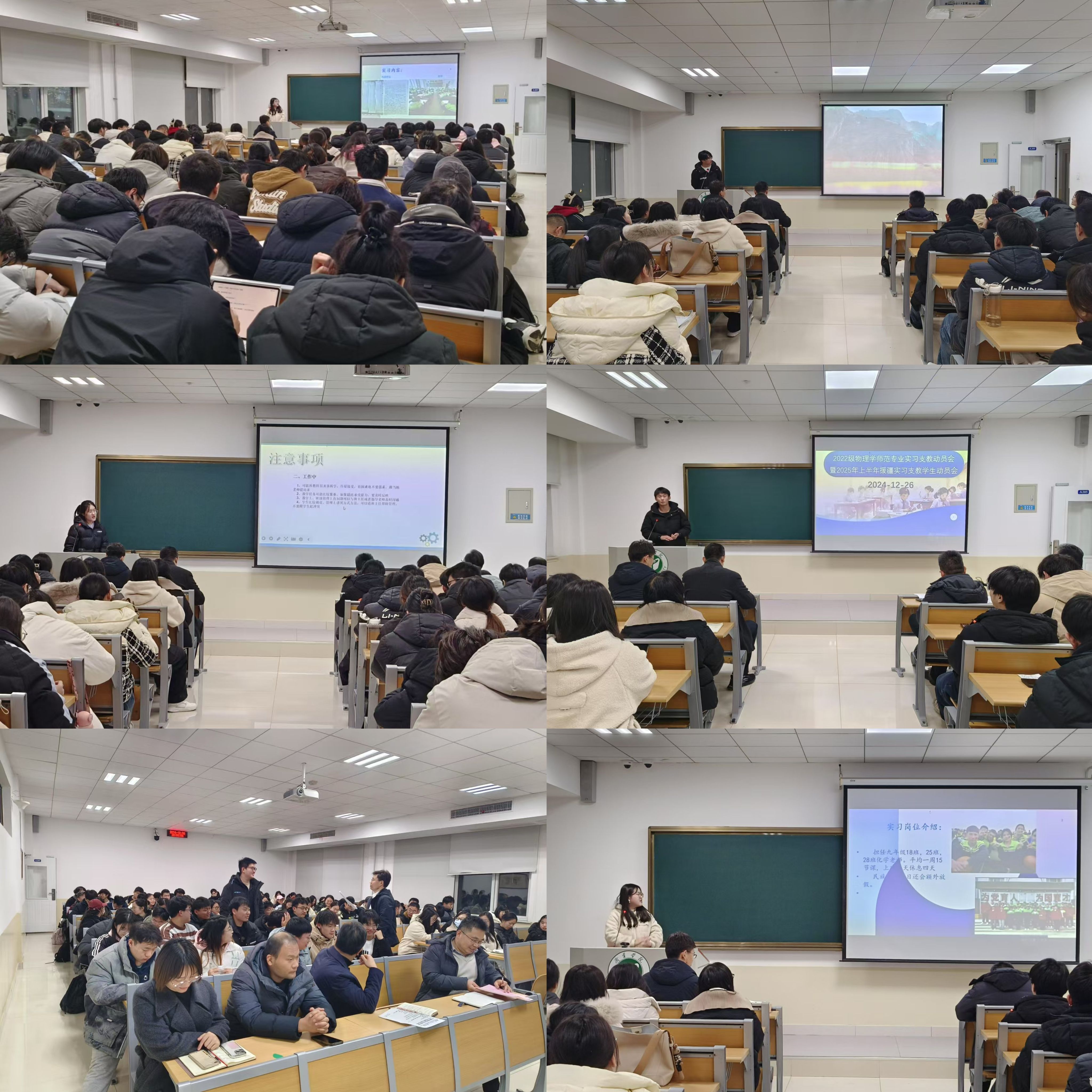 12月26日下午,物理与电子工程学院在9#A205智慧教室开展2025年上半年援疆实习支教学生动员会。党委书记卫建勋、学院副院长岳现房、物理系主任赵建华、系副主任、辅导员、班主任、2021级援疆支教实习代表、优秀实习生代表、2022级物理学师范专业全体同学等参加。会议由物理与电子工程学院党委副书记李洪波主持。