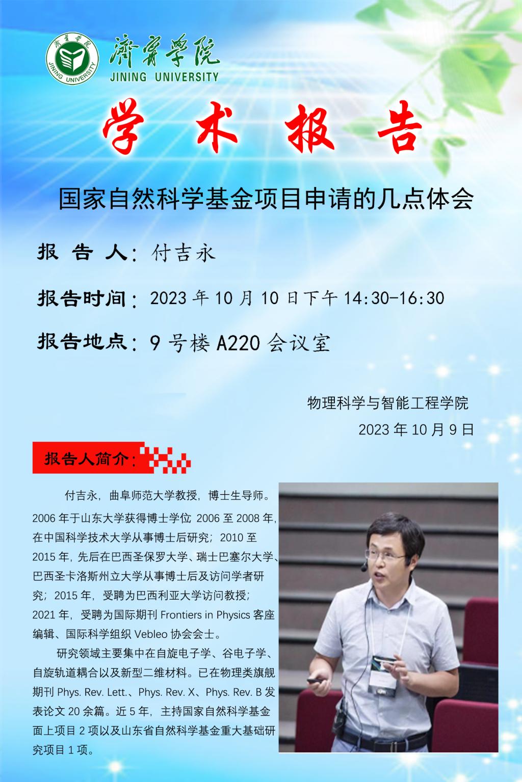 学术报告:曲阜师范大学付吉永教授——国家自然科学基金项目申请的几点体会