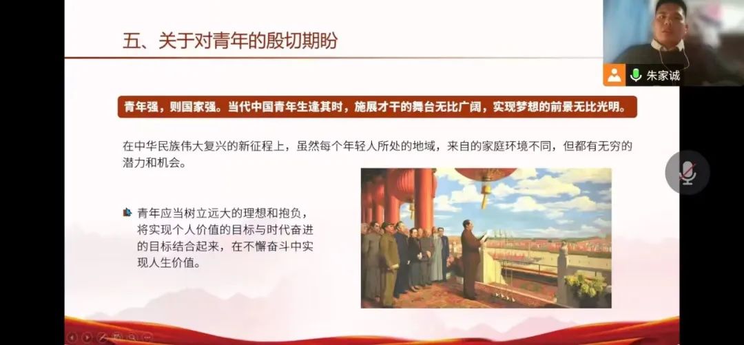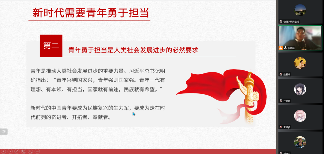 宣讲团以二十大为主题,会上,宣讲团指出,祖国呼唤青年担当,时代赋予青年重任。青年勇于担当是五四运动留给我们宝贵的精神财富,更是新时代中国特色社会主义对青年一代的重托和要求。青年兴则国家兴,青年强则国家强。青年一代有理想、有本领、有担当,国家就有前途,民族就有希望。要传承“信念坚定”的红色基因。红色基因形成于革命战争年代,是“砍头不要紧,只要主义真”的坚定执着,是湘西战役时“誓死保卫党中央”的铿锵誓言,是“干惊天动地事,做隐姓埋名人”的无怨无悔。立足新时代,党员青年要赓续革命先烈精神血脉,忠于党的信仰,忠于党的事业,始终坚守为中国人民谋幸福、为中华民族谋复兴的初心使命,做“对党忠诚”的践行者。