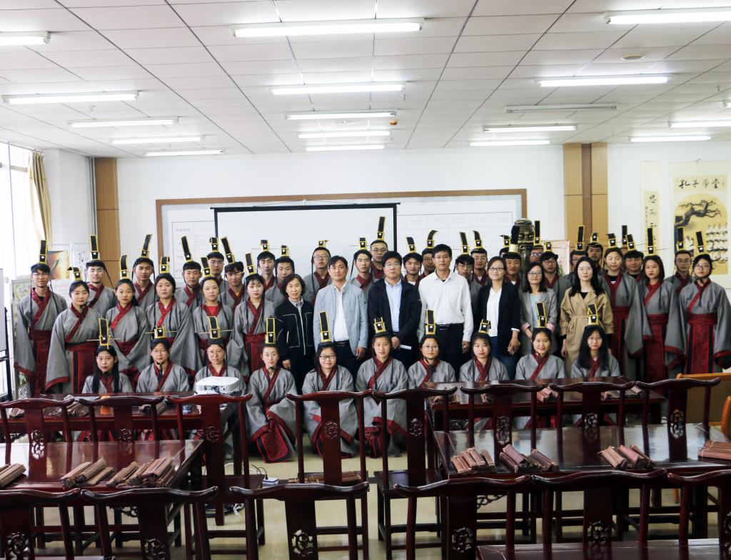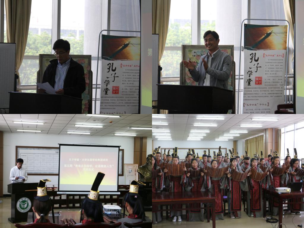 仪式伊始全体学员向至圣先师孔子行拜师礼,谦谦礼节彰显华夏文明;集体诵读《论语》经典篇目,朗朗诵读声振发学子赤诚之心;接着学员代表发言,循循善言拉近同窗共读之谊;物理与信息工程系党总支副书记李洪波致辞,阐述诵读国学经典的重要意义,勉励学员们在学习传统文化中“爱国、励志、求真、力行”;图书馆副馆长宋玉星讲话,提倡院系共建,聚力打造“孔子学堂”工作品牌;最后团委副书记蒿鹏宣布“孔子学堂•大学生国学经典诵读班第五期开班”。