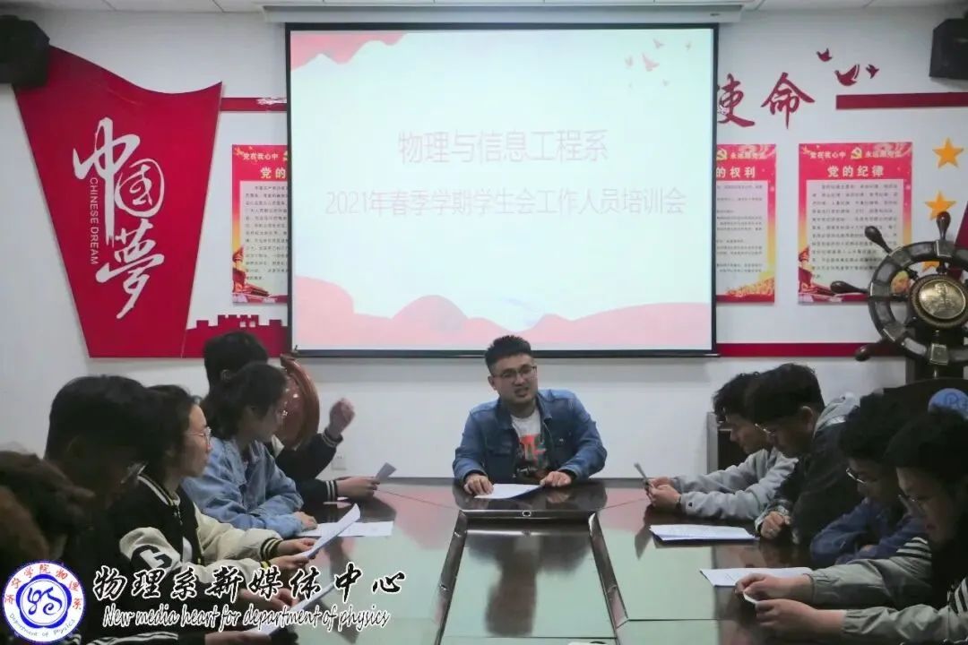 为贯彻落实从严治会要求,加强我系学生会各部门间的经验交流,调动学生会工作人员的积极性,提高学生会工作效率,同时为进一步加强党史理论学习,在党史学习中领悟党全心全意为人民服务的根本宗旨,物理与信息工程系学生会于4月22日18:30组织开展2021年春季学期学生会工作人员培训会。