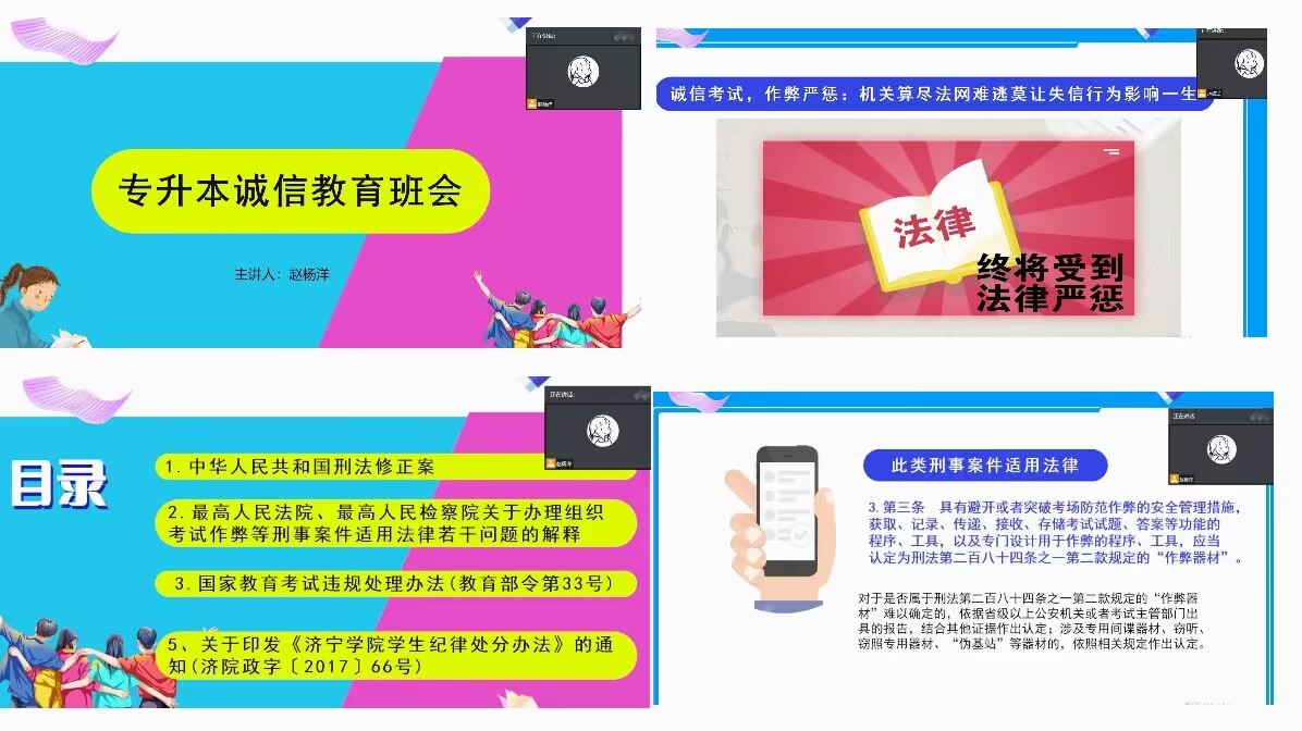 班会强调了诚信考试的重要性,并详细介绍了《中华人民共和国刑法修正案(九)》《最高人民法院、最高人民检察院关于办理组织考试作弊等刑事案件适用法律若干问题的解释》《国家教育考试违规处理办法》(教育部令第33号)等有关法律法规,同时带领同学们学习了济宁学院对于普通专升本违纪作弊考生的处分规定。最后,赵杨洋对专升本同学表达了殷切希望和美好祝福,希望大家在专升本考试中旗开得胜,顺利升入本科院校。