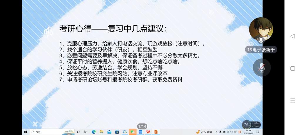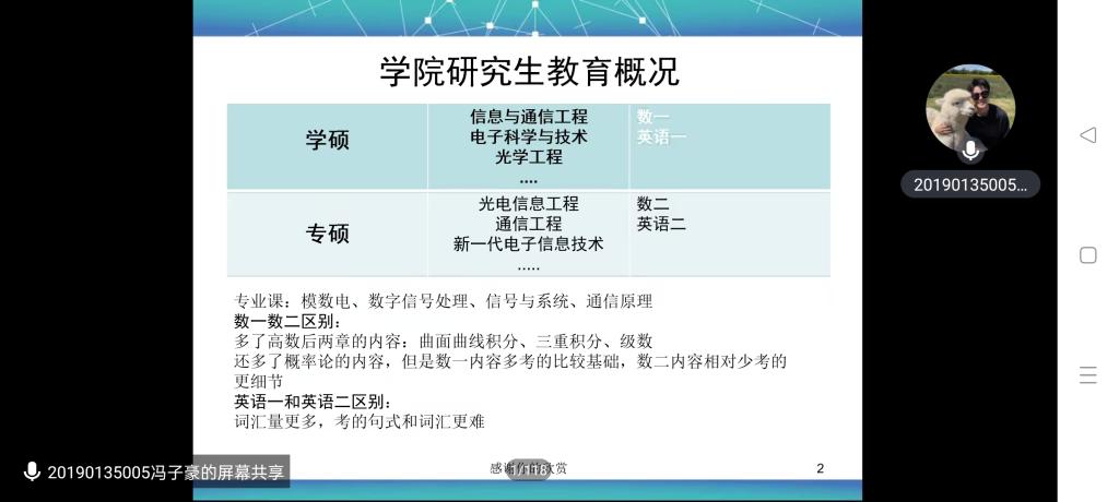 为增强电子信息工程专业学生对考研的了解,减轻同学现阶段的迷茫和焦虑,提高学习的积极性和主动性,4月27日晚,K体育·(sports)官方网站举办电子信息工程专业专场考研经验交流会。会议邀请了七位考研成功上岸的同学作线上交流分享,学院全体电子信工程专业学生参加会议。
