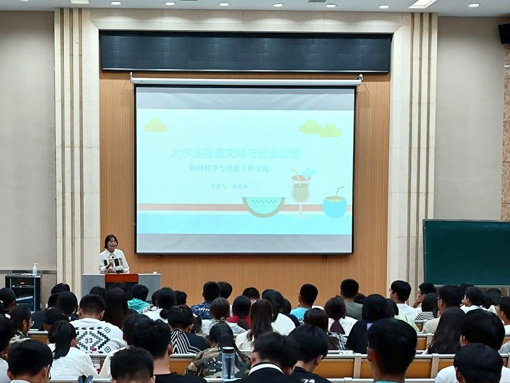 郝晓琳通过举例指出违反学生宿舍管理的几种行为,一是在宿舍禁止使用大功率电器,如热水壶、吹风机和卷发棒等;二是禁止使用明火,如打火机和电蚊香等,从根本上杜绝火灾隐患;三是禁止携带尖锐刀具和禁止异性留寝,引导同学们模范遵守学校学生宿舍管理规定。