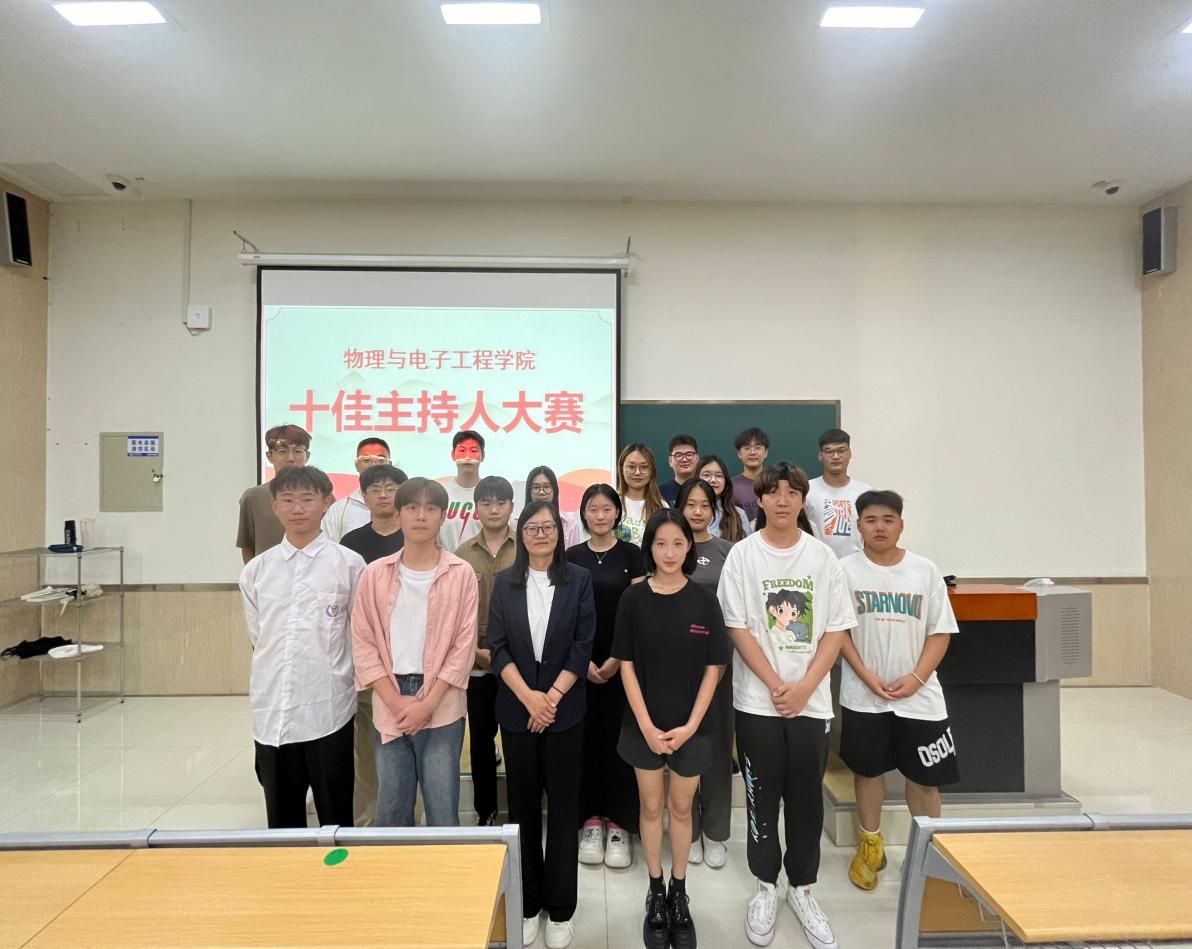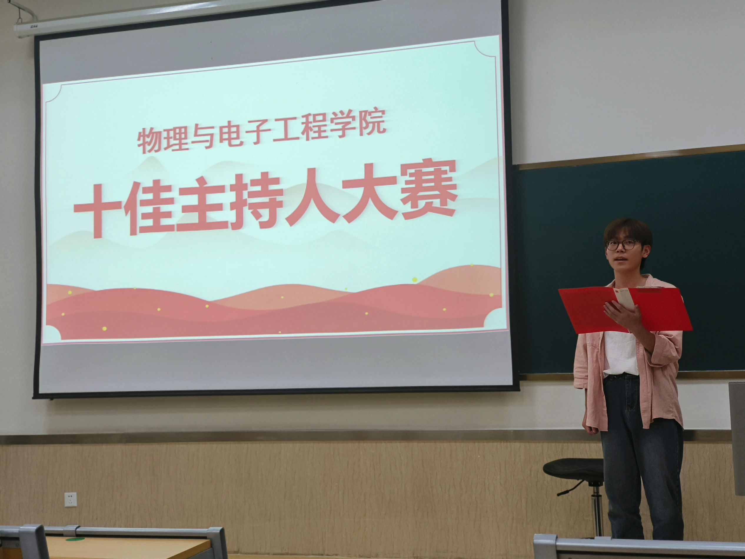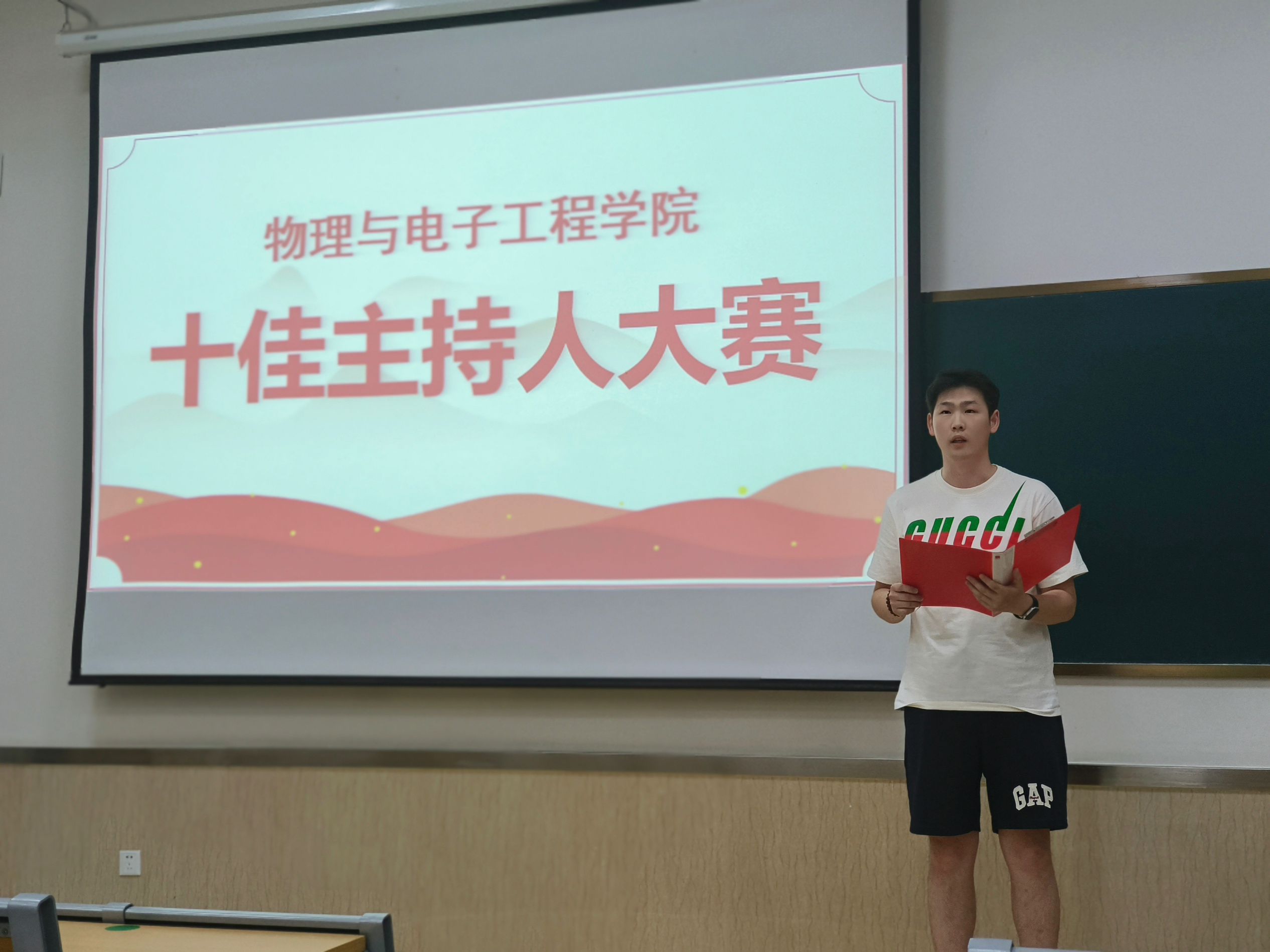 为庆祝中华人民共和国成立75周年,培养我校学生热爱祖国追求卓越的品质,践行“博学笃志,择善敦行”的校训,丰富我校同学的课余生活,加强校园语言文字规范化和普通话推广,6月3日下午,物理与电子工程学院在9D201举办了“十佳主持人”大赛,学院团委书记赵杨洋出席活动,2022级、2023级部分同学参加活动。