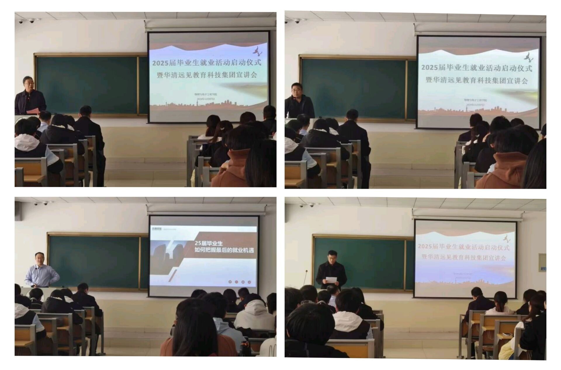 为给2025届毕业生提供更多的就业机会和职业发展指导,帮助他们更好地了解市场需求和行业动态,11月7日,物理与电子工程学院在9A204举行2025届毕业生就业服务月启动仪式暨华清远见教育科技集团宣讲会活动。学院党委书记卫建勋、副院长岳现房、华清远见教育科技集团副总裁李鹏、党委副书记李洪波、学术副院长田涛、辅导员明强和2025届部分毕业生参加了活动,活动由李洪波主持。