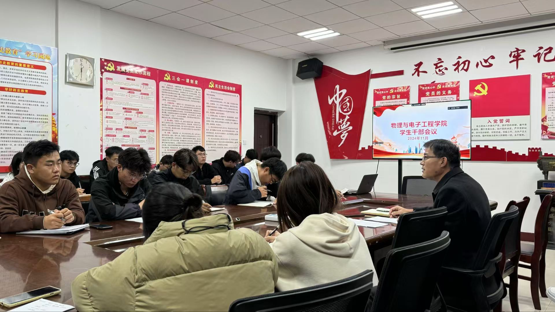 为进一步加强学院学风建设,规范学生行为,营造良好的学习与生活环境,11 月 13 日,物理与电子工程学院召开学生干部会议。学院党委副书记李洪波及主要学生干部参加会议。