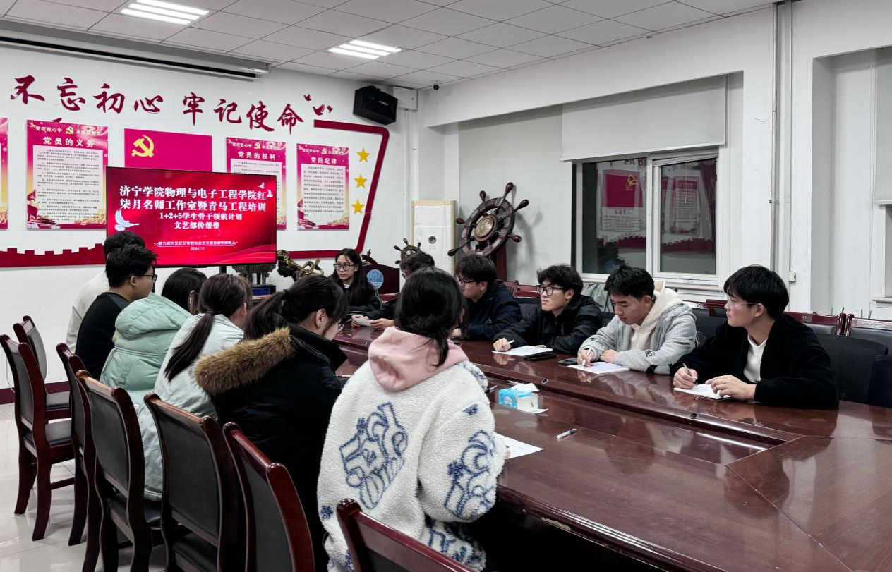 为加强学生会文艺部团队建设,提升学生骨干综合素养,传承优秀工作经验,形成良好的团队协作与人才培养机制,11月30日,物理与电子工程学院在9号楼2楼会议室召开了“1+2+5学生骨干领航计划”学生会文艺部传帮带暨青马工程培训。学院22级文艺部部长王阳、副部长张丽萍以及全体文艺部成员参加培训会。