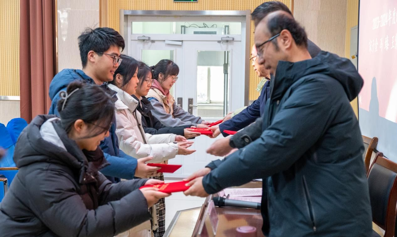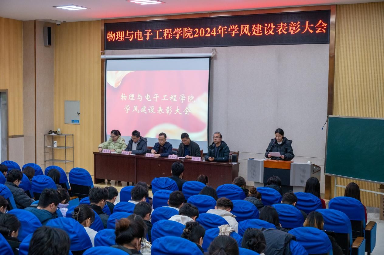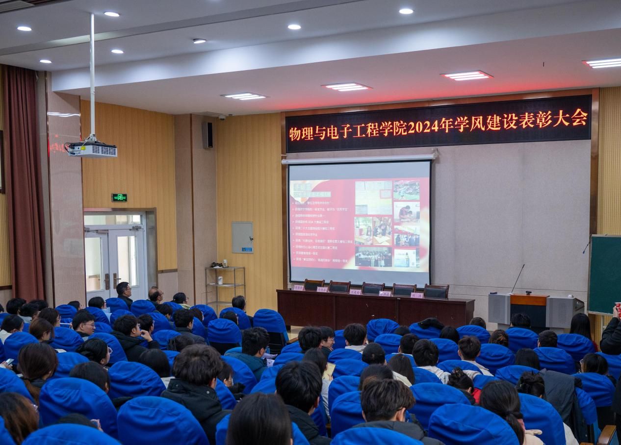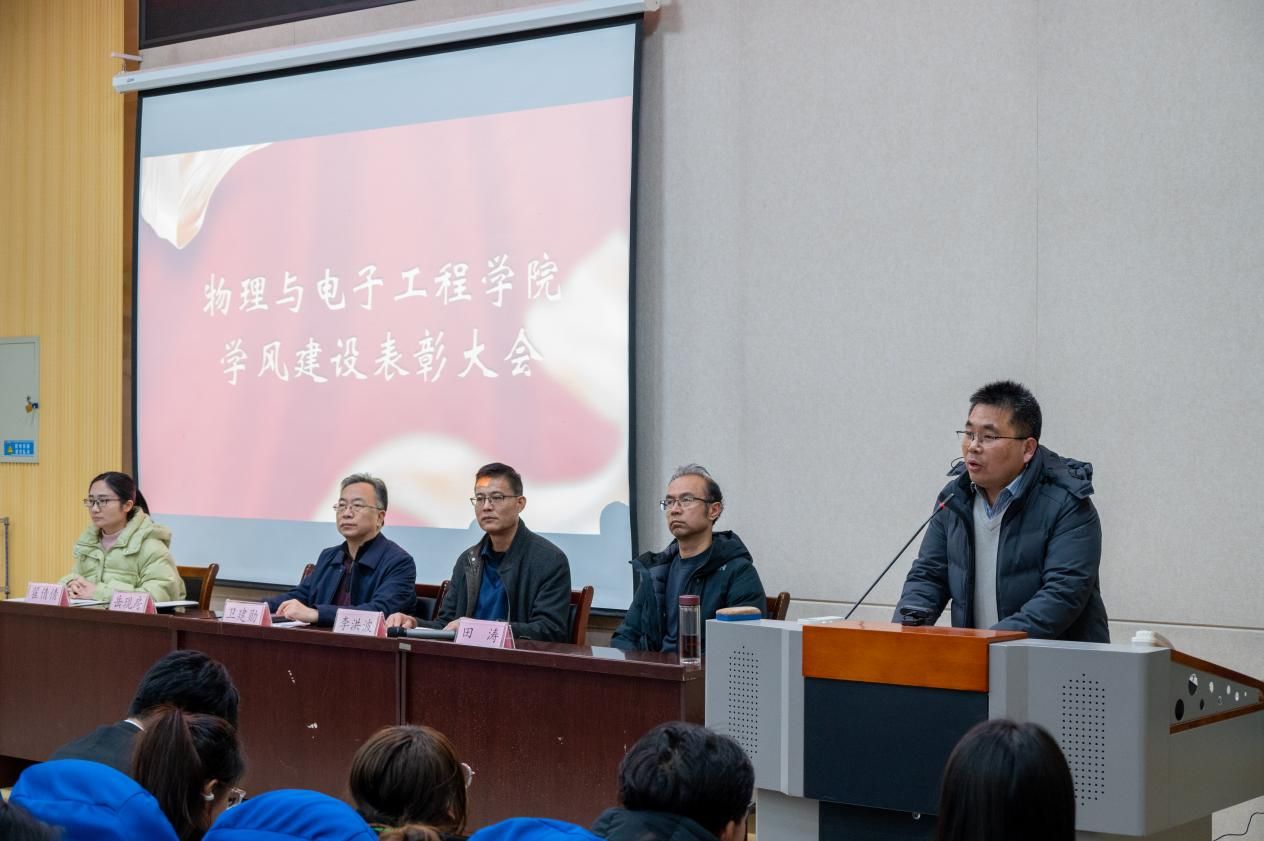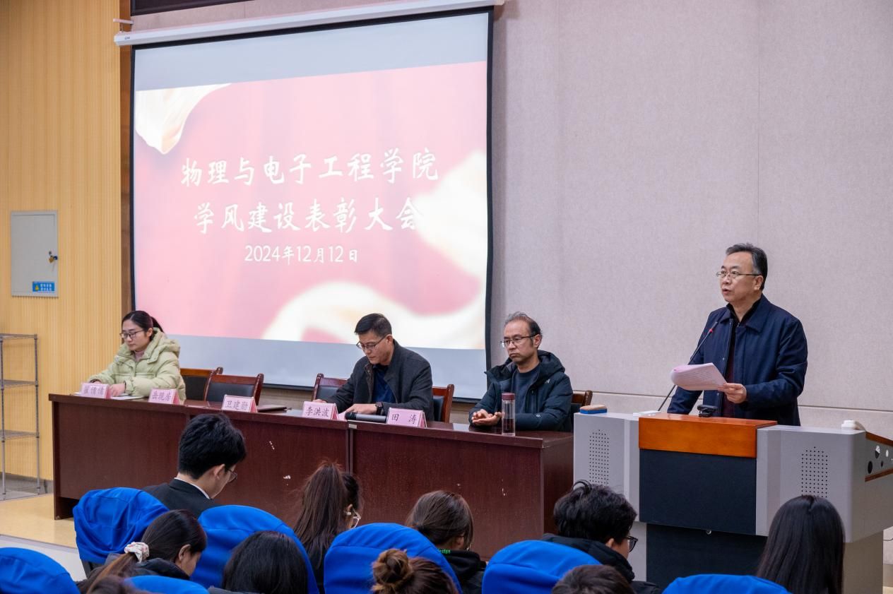 为进一步强化教学与学风建设,营造优质的校园学习氛围,提升学风管理水平,优化育人环境,构建三全育人长效机制,物理与电子工程学院不断扎实推进学院学风建设,开展了一系列学风建设活动,为了更好地发挥朋辈引领的作用,大力宣传“物理榜样”,凝聚“物理力量”,2024年12月12日,物理与电子工程学院召开学风建设表彰大会,表彰一批在学习能力、学科竞赛等方面成绩突出的优秀同学。物理与电子工程学院领导班子成员、辅导员老师和新生参加本次大会。本次大会由学院党委副书记李洪波主持。