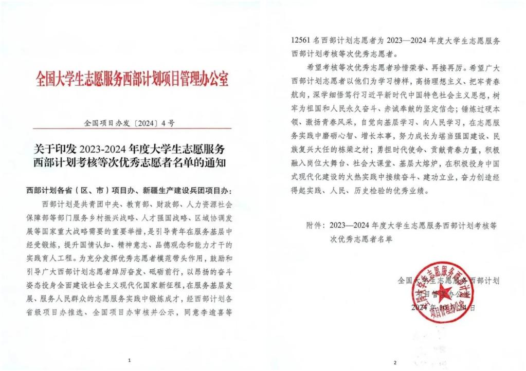在全国大学生志愿服务西部计划项目管理办公室发布的《关于印发2023-2024年度大学生志愿服务西部计划考核等次优秀志愿者名单的通知》中,K体育·(sports)官方网站2023届毕业生李政同学凭借出色的服务表现和卓越的贡献,荣获2023-2024年度全国大学生志愿服务西部计划考核等次优秀志愿者。