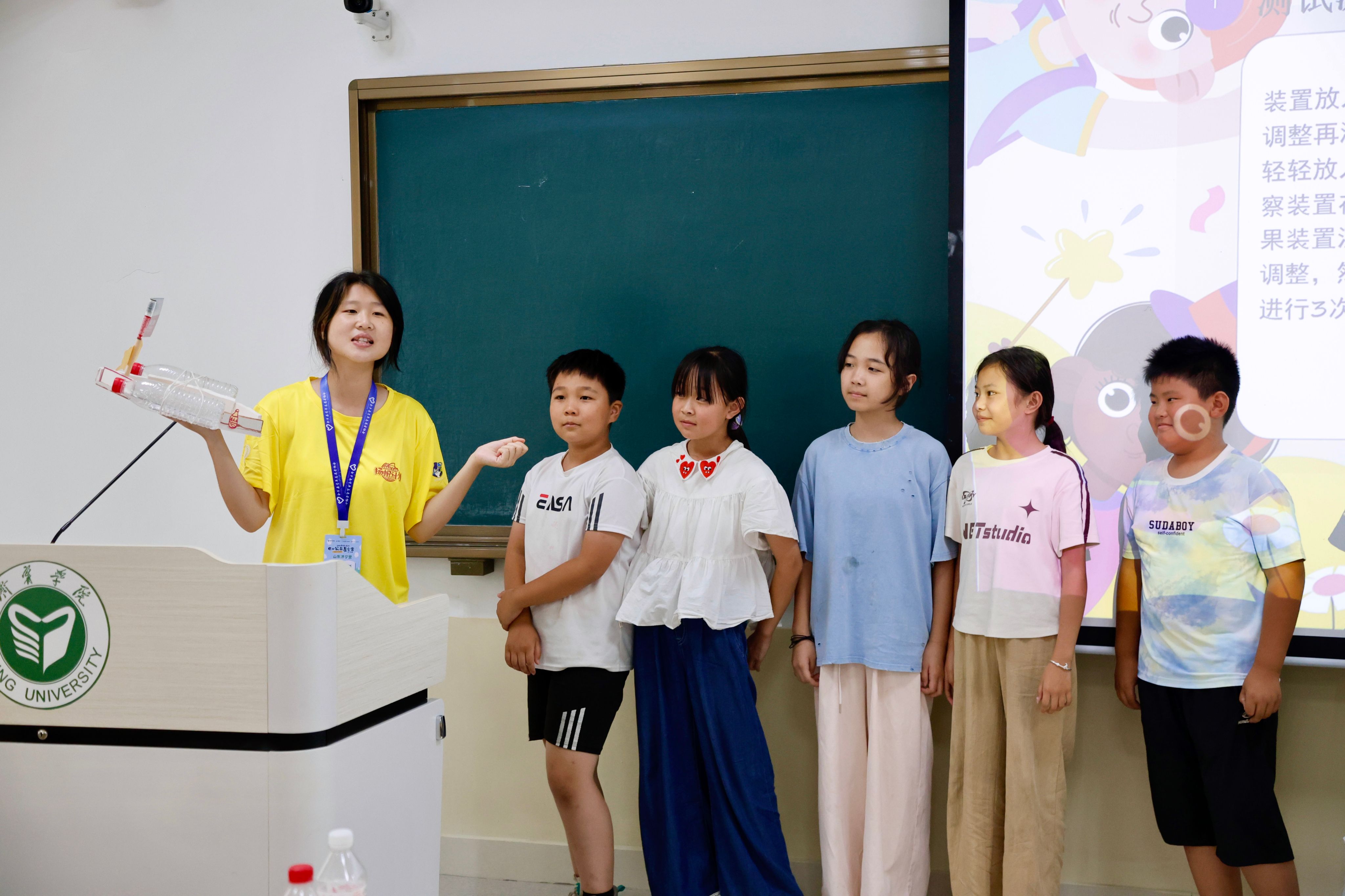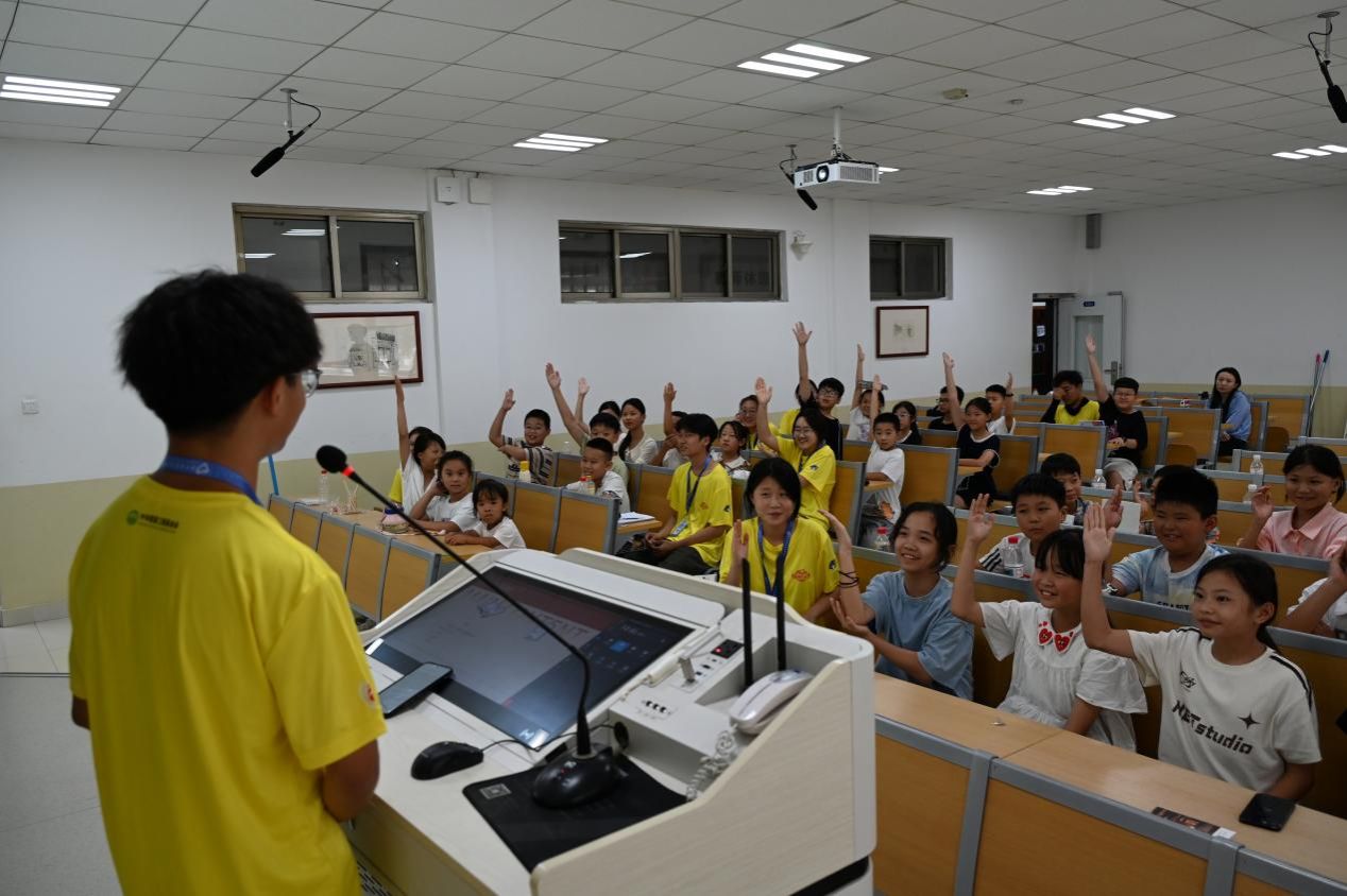 “校园探秘寻迹”环节中,孩子们手持任务卡,穿梭于绿荫掩映的校园。图书馆前,“先师行教”青铜群雕巍然矗立,孩子们凝神仰望,仿佛聆听着千年前的谆谆教诲;理科楼铜像亭下,孩子们好奇地打量着每一尊铜像,在志愿者的讲解中,他们眼中满是对知识的渴望,仿佛在和这些伟大的科学家进行跨越时空的对话。“奇妙科学探索营”点燃了大家的好奇之火。“浮力幻想”实验,漂浮的鸡蛋与下沉的石块,引发现场阵阵“为什么”的追问,寻常的木棍、泡沫板在孩子们手中幻化为形态各异的漂浮装置。亲手操作的乐趣,让深奥的科学原理变得可触可感,科学的种子在实践中悄然生长。“知识大闯关”竞赛将气氛推向高潮,积分领先的团队喜获定制奖品。
