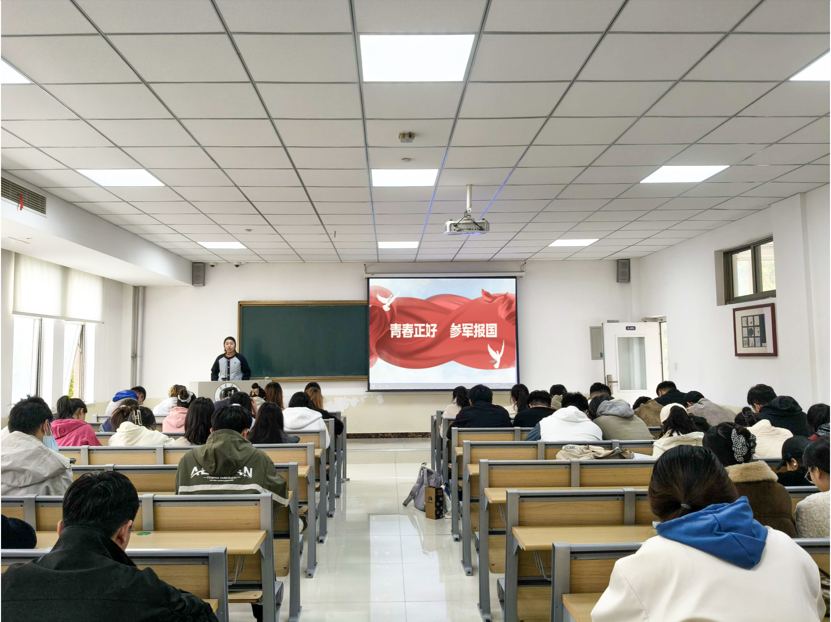 随后,石钰霖同学对大学生征兵的各项政策进行了全面而细致的解读。他重点介绍了同学们最为关心的入伍条件、报名流程、学业保障、经济优待、考研加分、公务员及事业单位招录优先等优惠政策。讲解深入浅出,条理清晰,为有意向参军入伍的同学指明了方向,扫除了疑虑。
