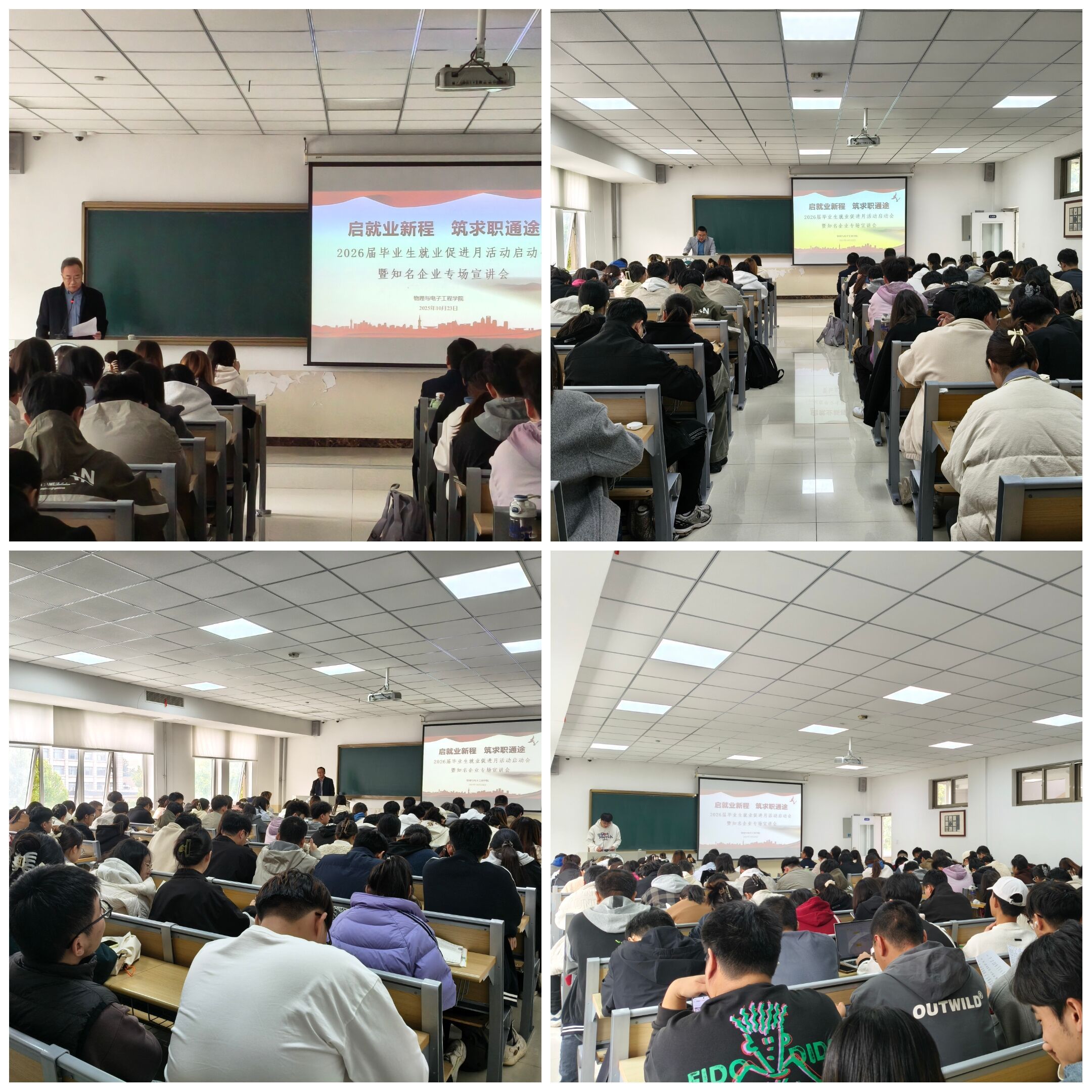 为切实做好2026届毕业生就业服务工作,搭建毕业生与优质企业间的高效沟通桥梁,帮助学子明确就业方向、提升求职竞争力,10月23日,物理与电子工程学院在9A401隆重举办“启就业新程 筑求职通途——2026届毕业生就业促进月活动启动会暨知名企业专场宣讲会”。学院党委书记卫建勋、院长岳现房、党委副书记辛允东出席活动,2026届全体毕业生及部分企业代表参加,活动由辛允东主持。