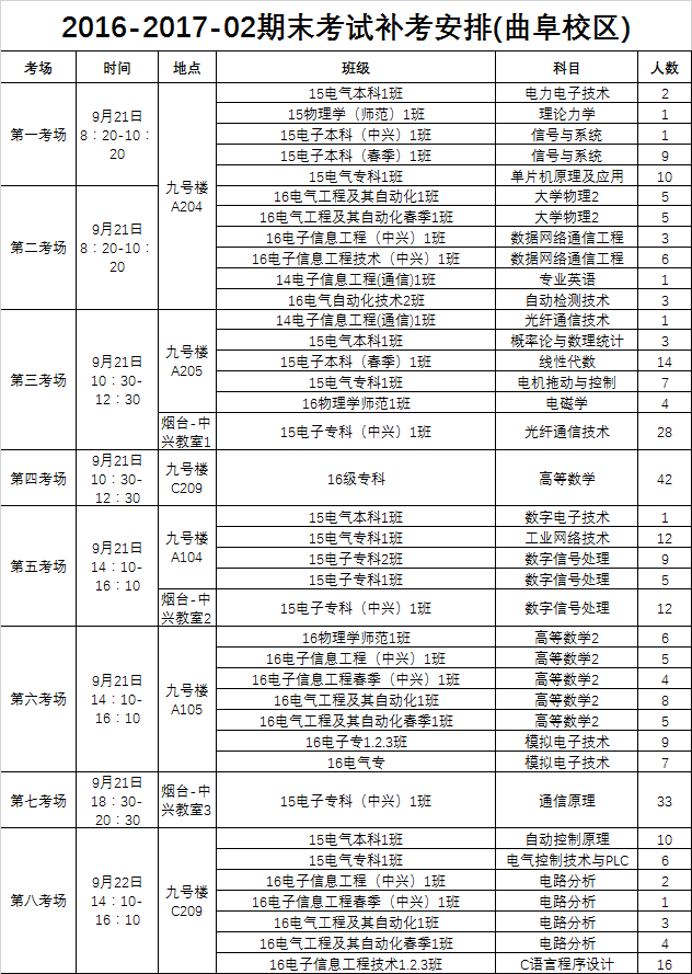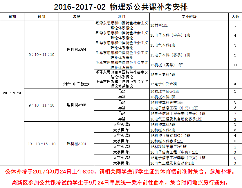 物理与信息工程系2016-2017-02专业课公共课补考安排