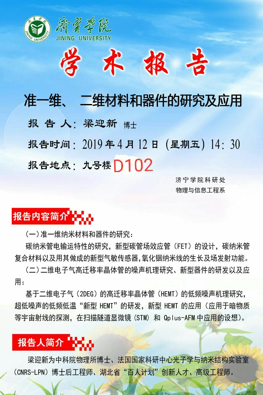 梁迎新博士学术报告“准一维二维材料和器件的研究及应用”预告