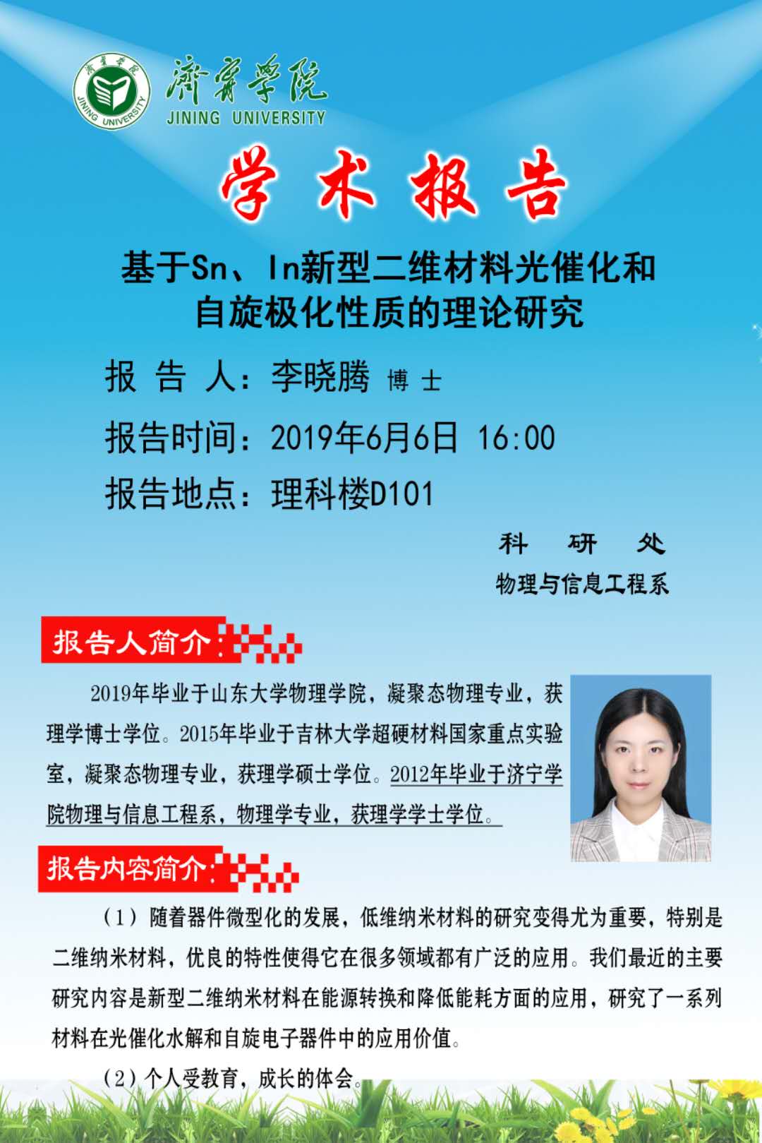 李晓腾博士《基于Sn、In新型二维材料光催化和自旋极化性质的理论研究》学术报告预告