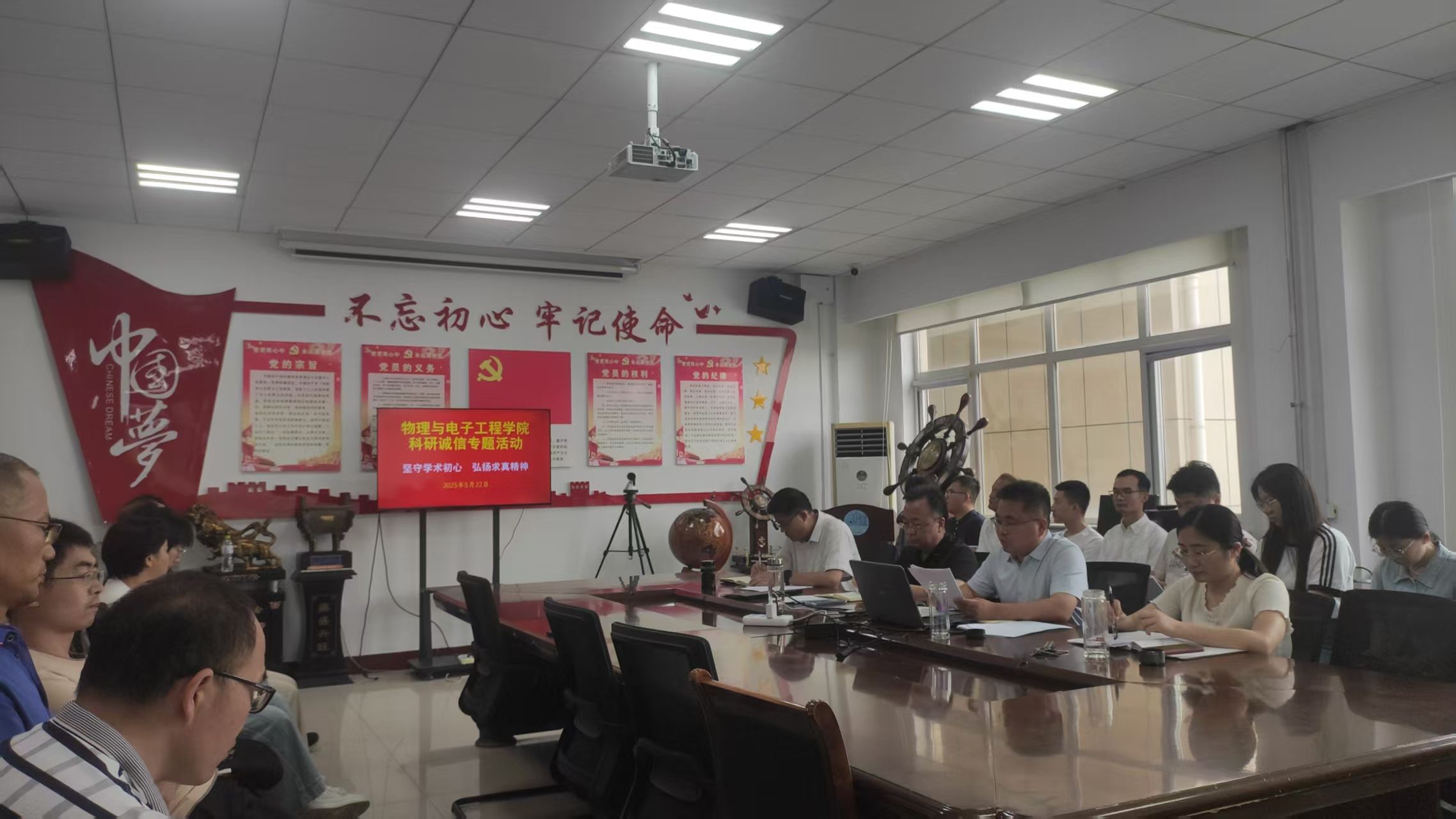 为深入贯彻落实科研诚信建设要求,进一步强化学术道德规范,营造风清气正的学术环境。5月22日,物理与电子工程学院组织全体教师召开科研诚信专题活动,以“坚守学术初心 弘扬求真精神”为主题,系统推进科研诚信宣传教育。会议由学院副院长岳现房主持。