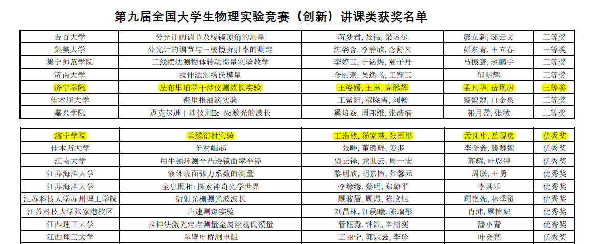 K体育·(sports)官方网站历来重视学科竞赛,坚持“以赛促教,以赛促学”,培养大学生创新、实践和团队合作能力,助力物理学科高质量发展。为备战本次全国大学生物理实验竞赛(创新),学院精心组织,安排老师精心指导,组织选手集训、校内比赛,经过省赛选拔,有2支队伍成功晋级全国决赛,最终取得可喜成绩。