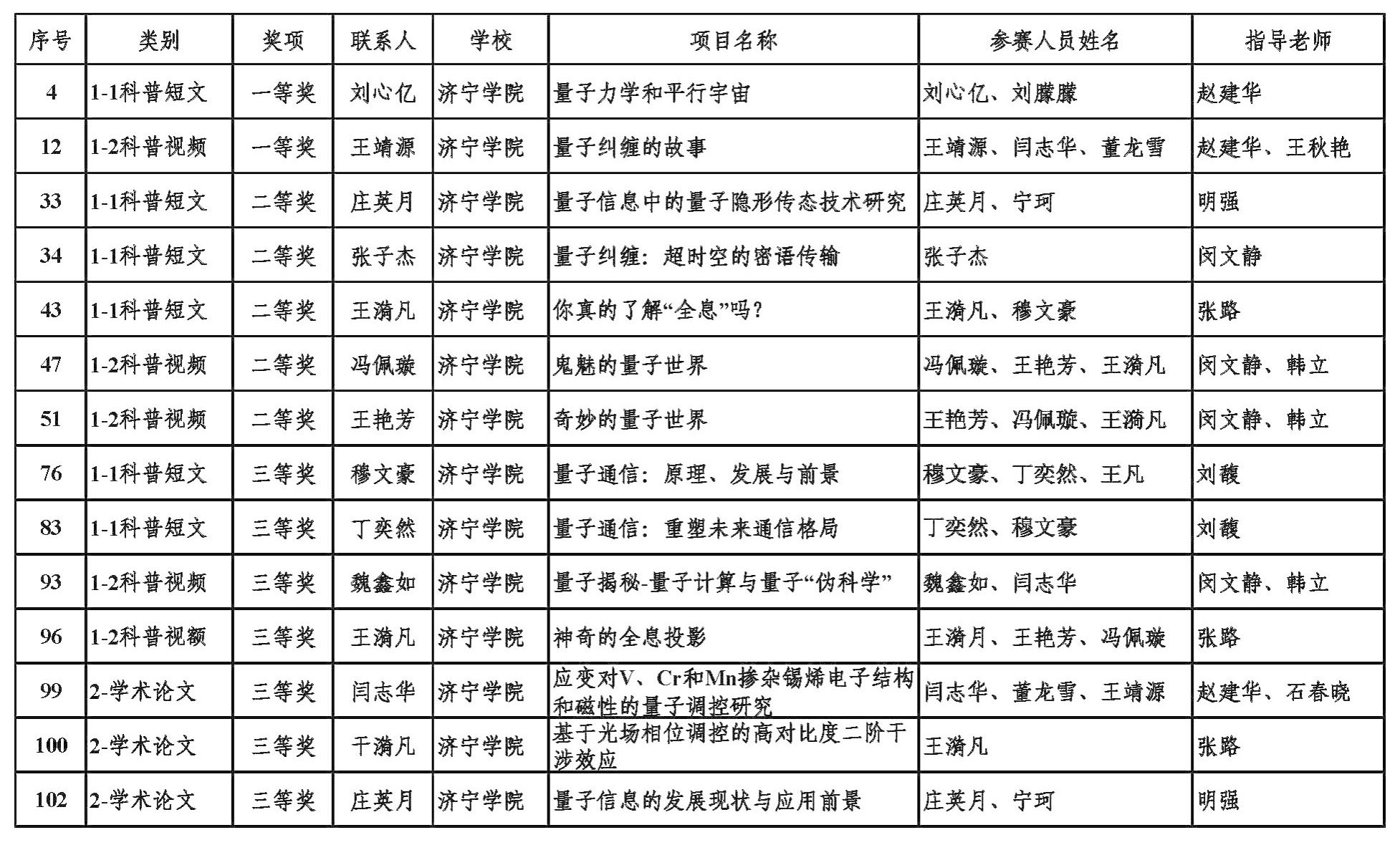10月22日,山东省大学生科技节的活动之一山东省大学生物理实验大赛-首届“九章杯”量子信息竞赛圆满落幕。经过激烈角逐,物理与电子工程学院学生刘心亿、王靖源、王漪凡等同学负责的14项作品在此次竞赛中脱颖而出,共荣获一等奖2项,二等奖5项和三等奖7项。赵建华老师应邀作为赛事的评审委员参加了会议。