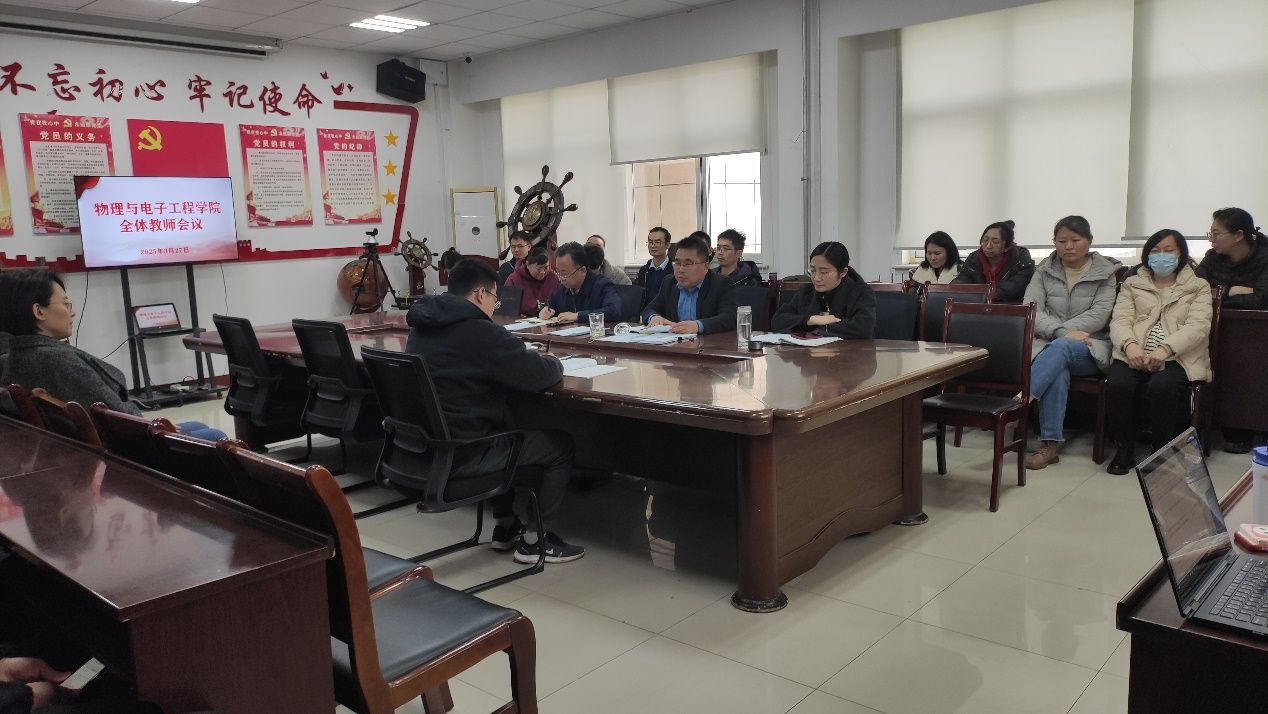 3月27日下午,物理与电子工程学院在学院会议室召开全体教职工会议,会议由党委书记卫建勋主持。